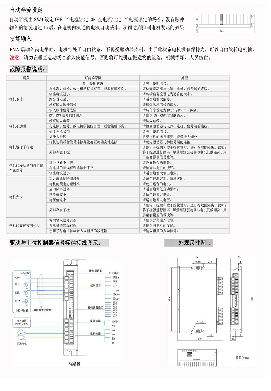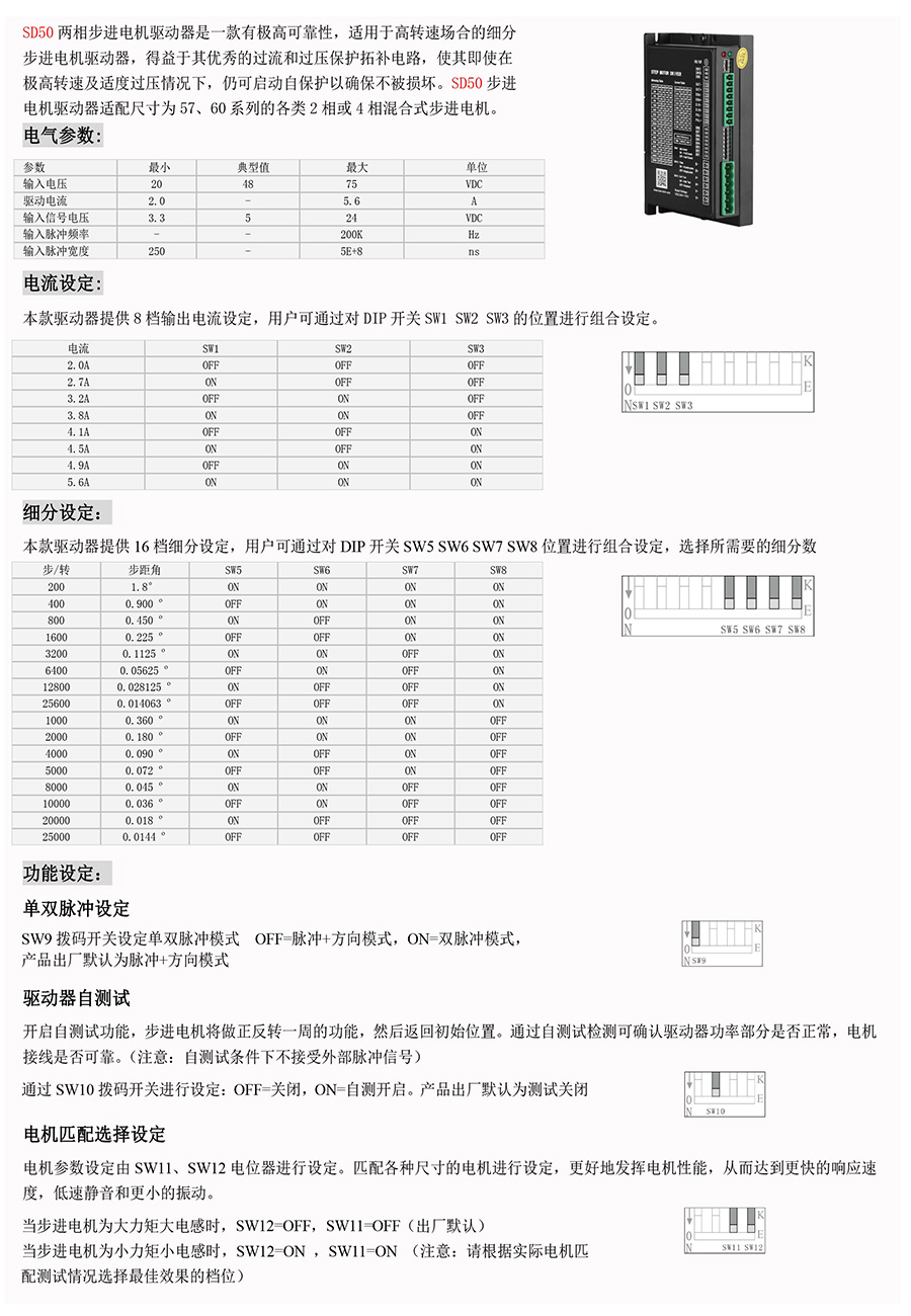 产品概述:SD50 两相步进电机驱动器是一款有极高可靠性,适用于高转速场合的细分 步进电机驱动器,得益于其 的过流和过压保护拓补电路,使其即使在 极高转速及适度过压情况下,仍可启动自保护以确保不被损坏。SD50 步进 电机驱动器适配尺寸为 57、60 系列的各类 2 相或 4 相混合式步进电机。