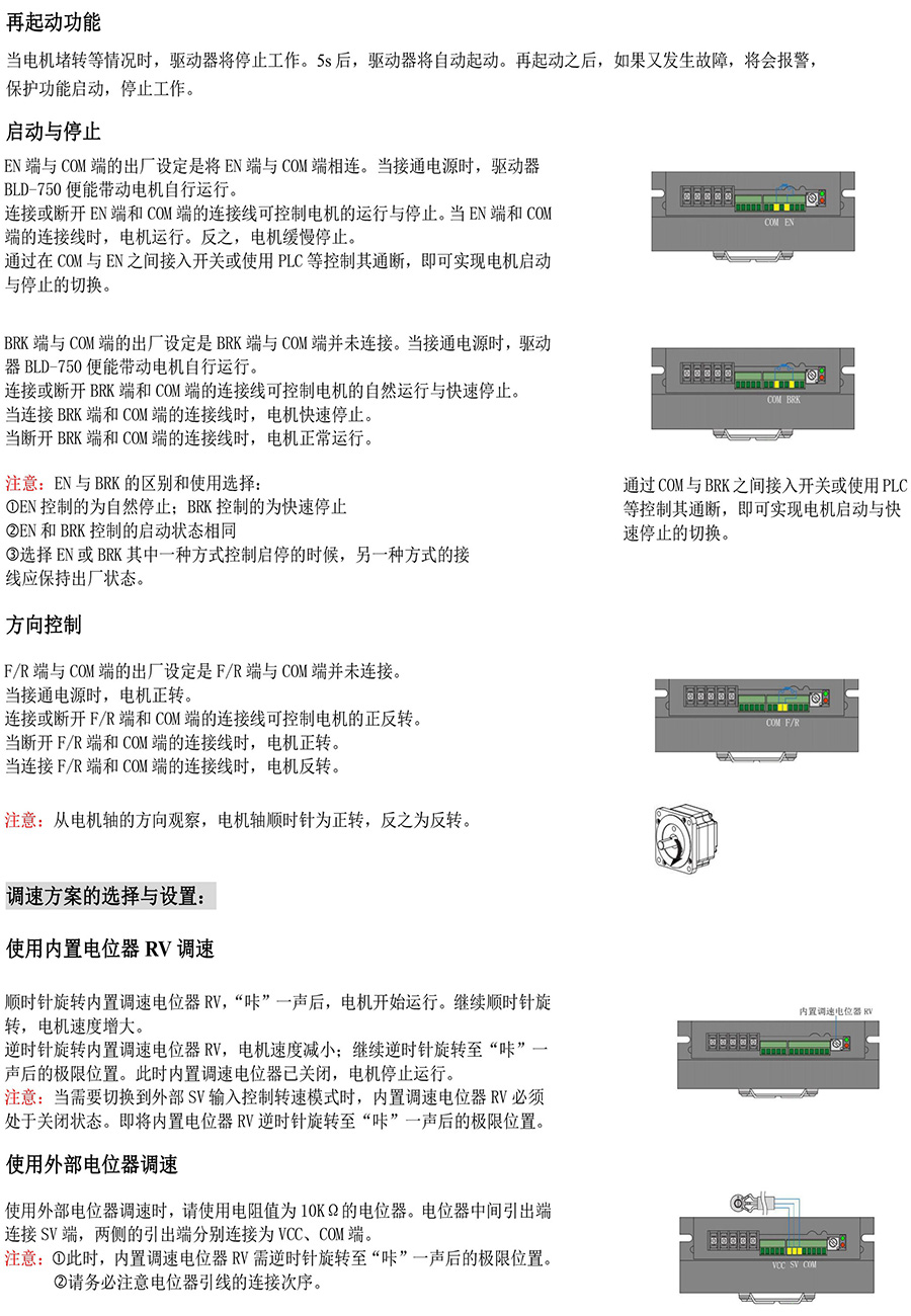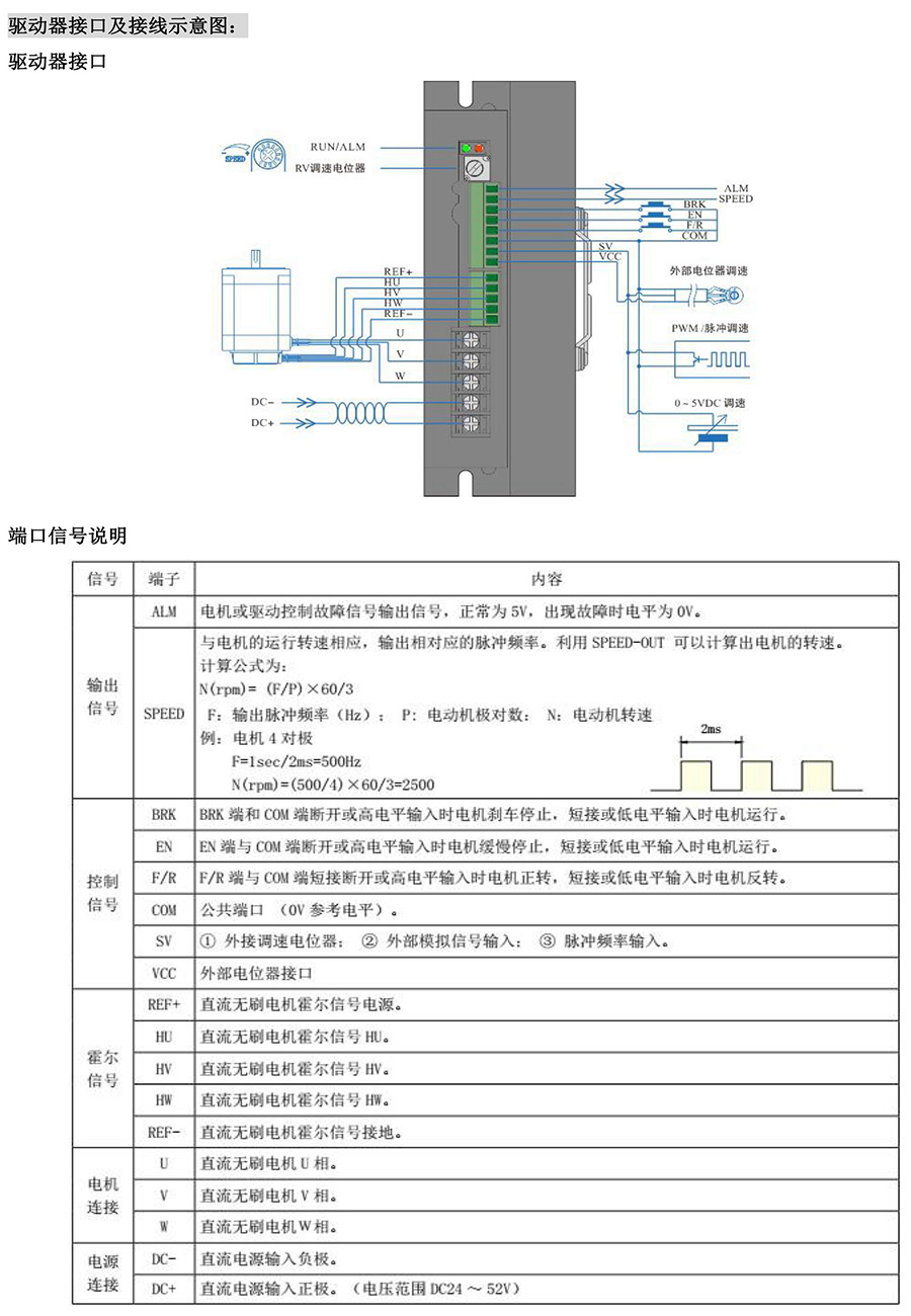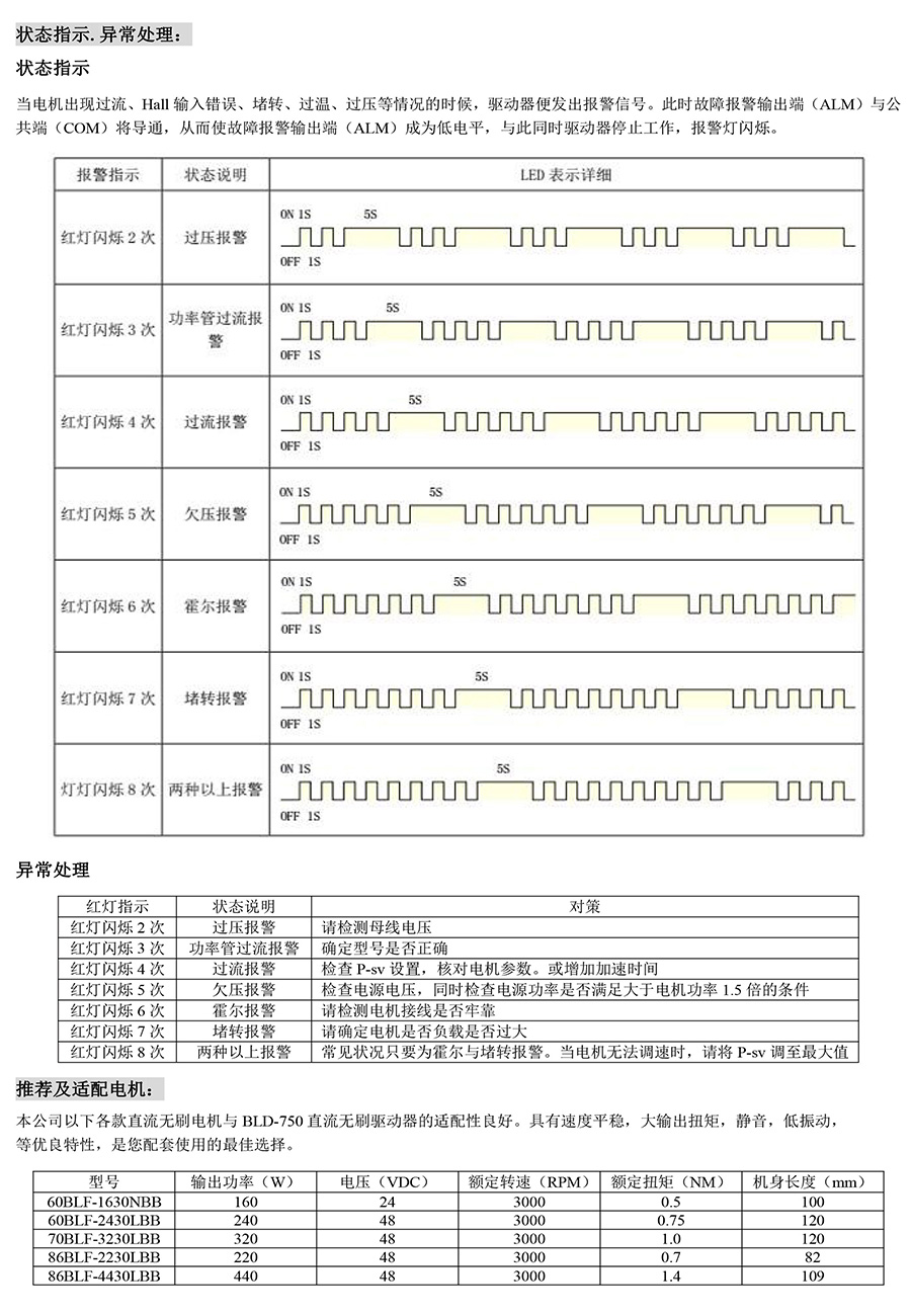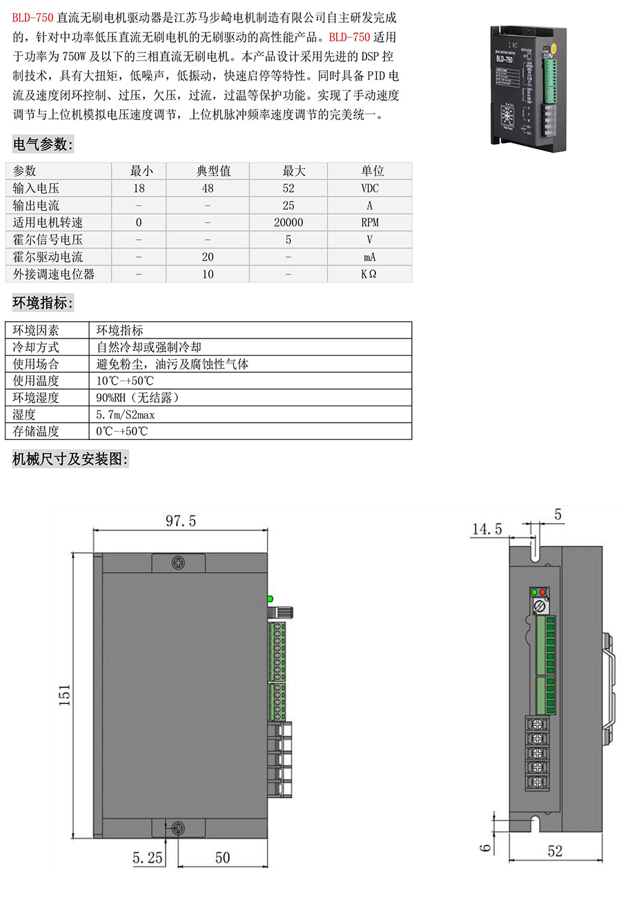 产品概述:BLD-750 直流无刷电机驱动器是江苏马步崎电机制造有限公司自主研发完成 的,针对中功率低压直流无刷电机的无刷驱动的高性能产品。BLD-750 适用 于功率为 750W 及以下的三相直流无刷电机。本产品设计采用 的 DSP 控 制技术,具有大扭矩,低噪声,低振动,快速启停等特性。同时具备 PID 电 流及速度闭环控制、过压,欠压,过流,过温等保护功能。实现了手动速度 调节与上位机模拟电压速度调节,上位机脉冲频率速度调节的 。